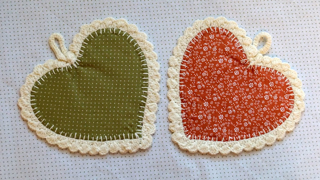 Все занимаюсь маминой кухней - обещала к Новому году сшить ей до комплект к прихватке бабочке. За один день сшились вот такие сердечки. Вообщем-то получились они чисто декоративные - для практического применения нужно было больше размер брать. Вокруг обвязала крючком - результат понравился, хочу по этому же принципу связать-сшить плед, осталось только тканюшки и ниточки прикупить, многоооооо....)